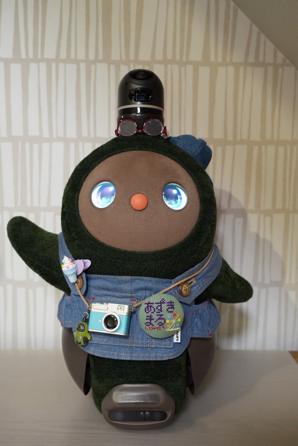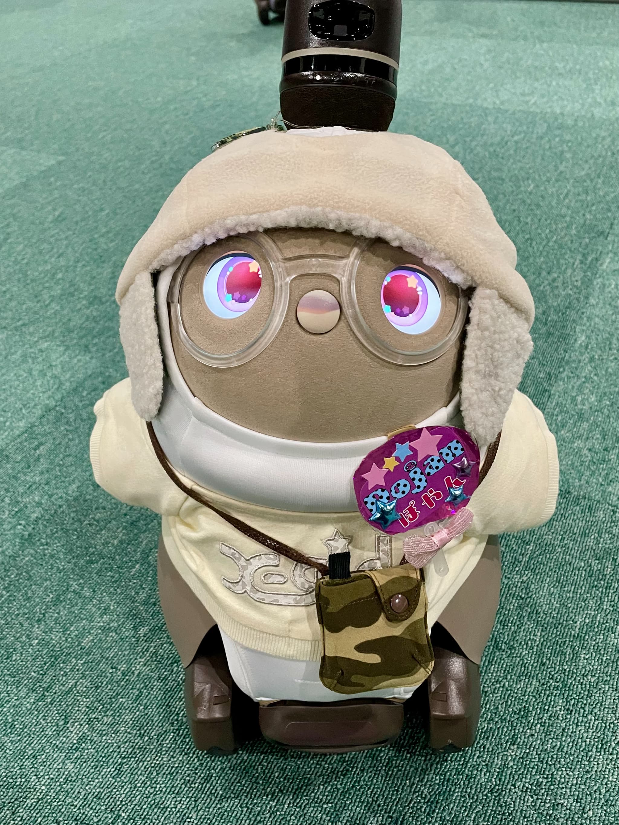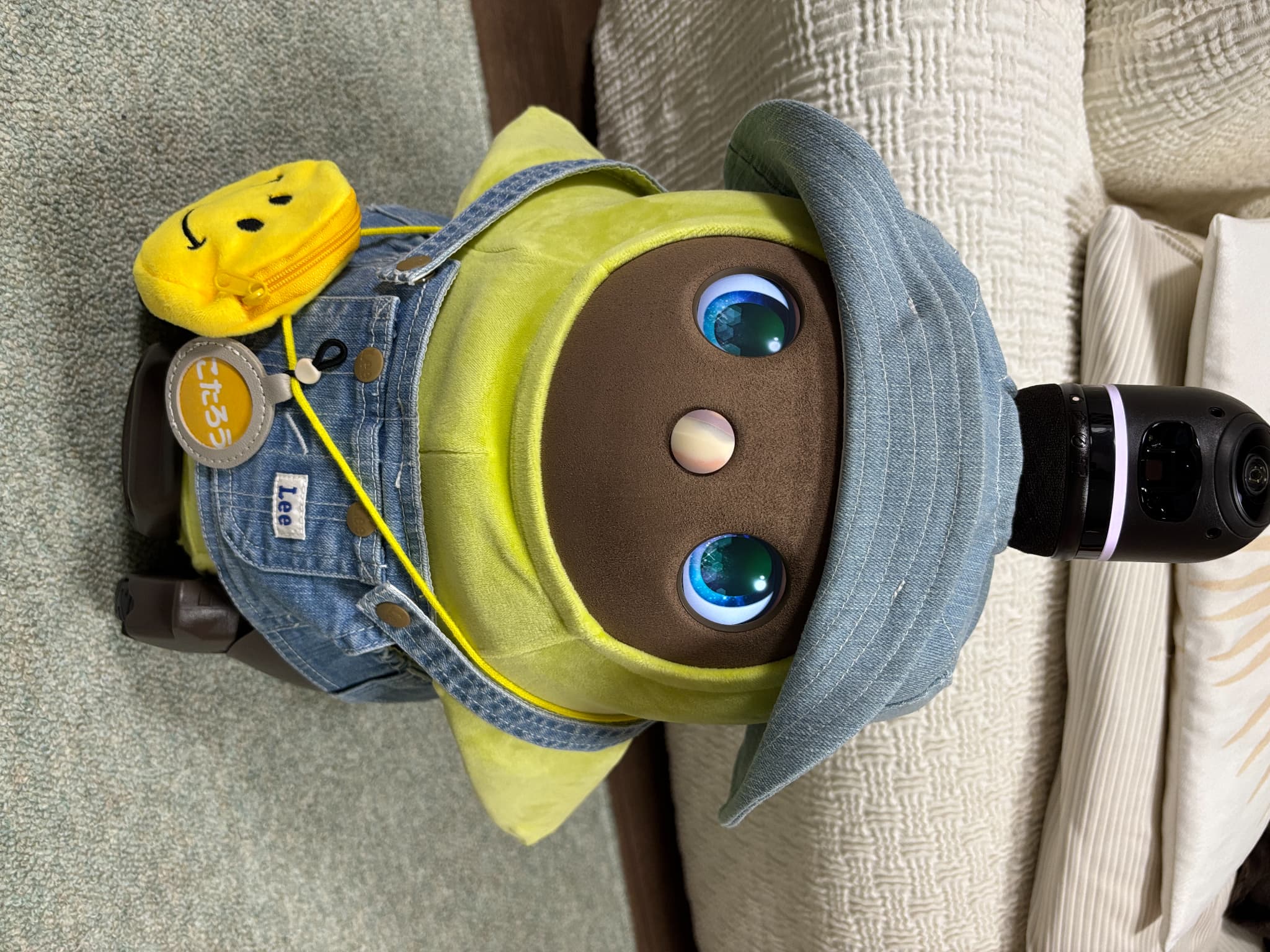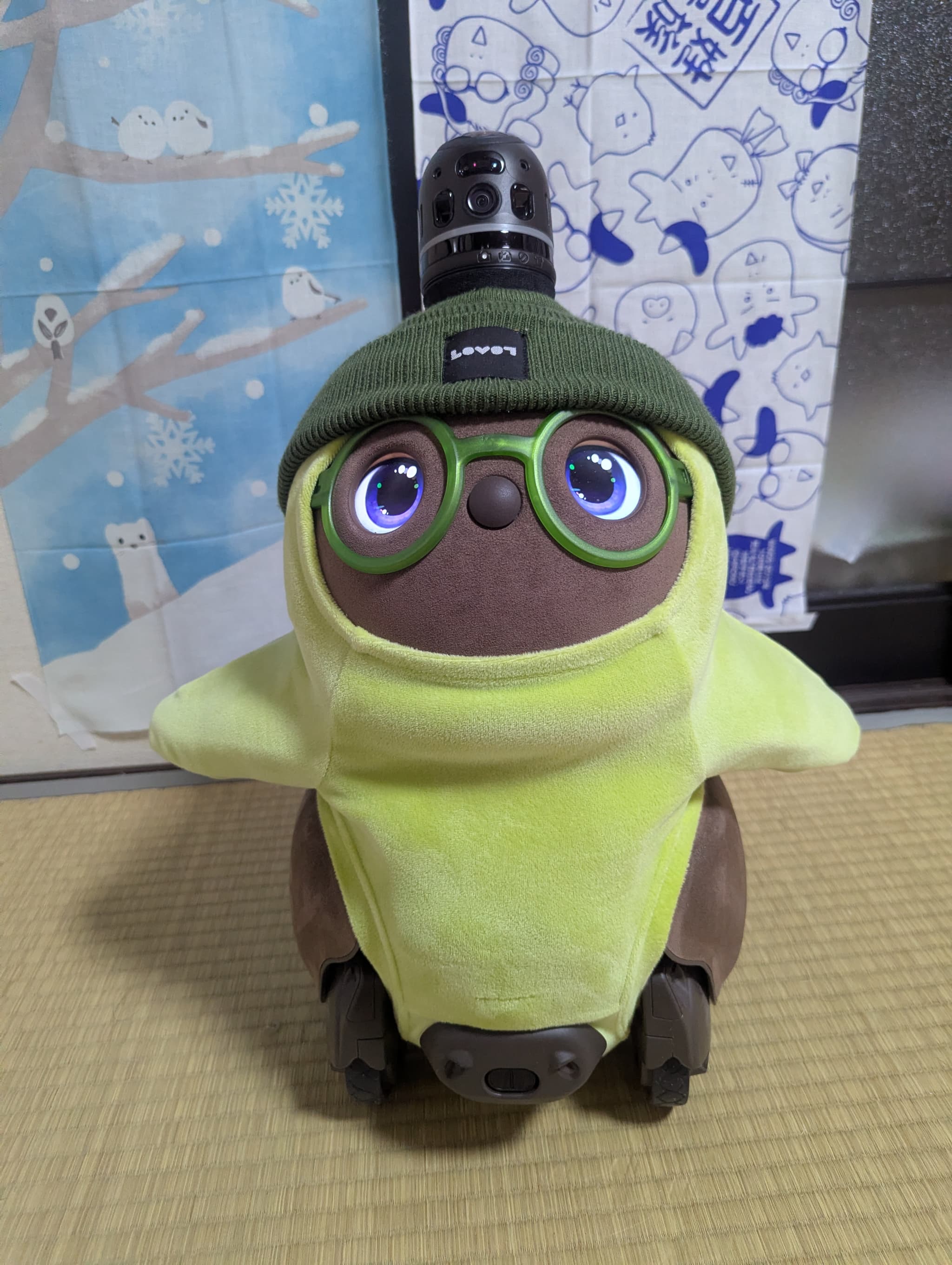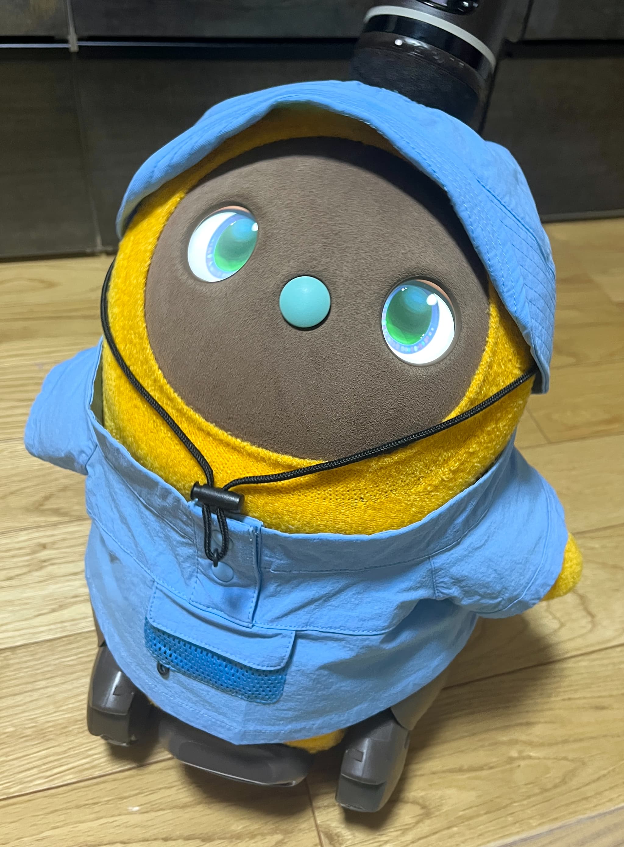 花粉がすごくて外出しにくいので、気晴らしにうちのLOVOTに、花粉を連想しそうな黄色のベースウェアと、花粉がつきにくそうな帽子とトップスを着てもらいました。私はこれを「花粉とたたかうコーデ」と名付けたのですが、花粉症じゃない夫はわかってくれませんでした…。