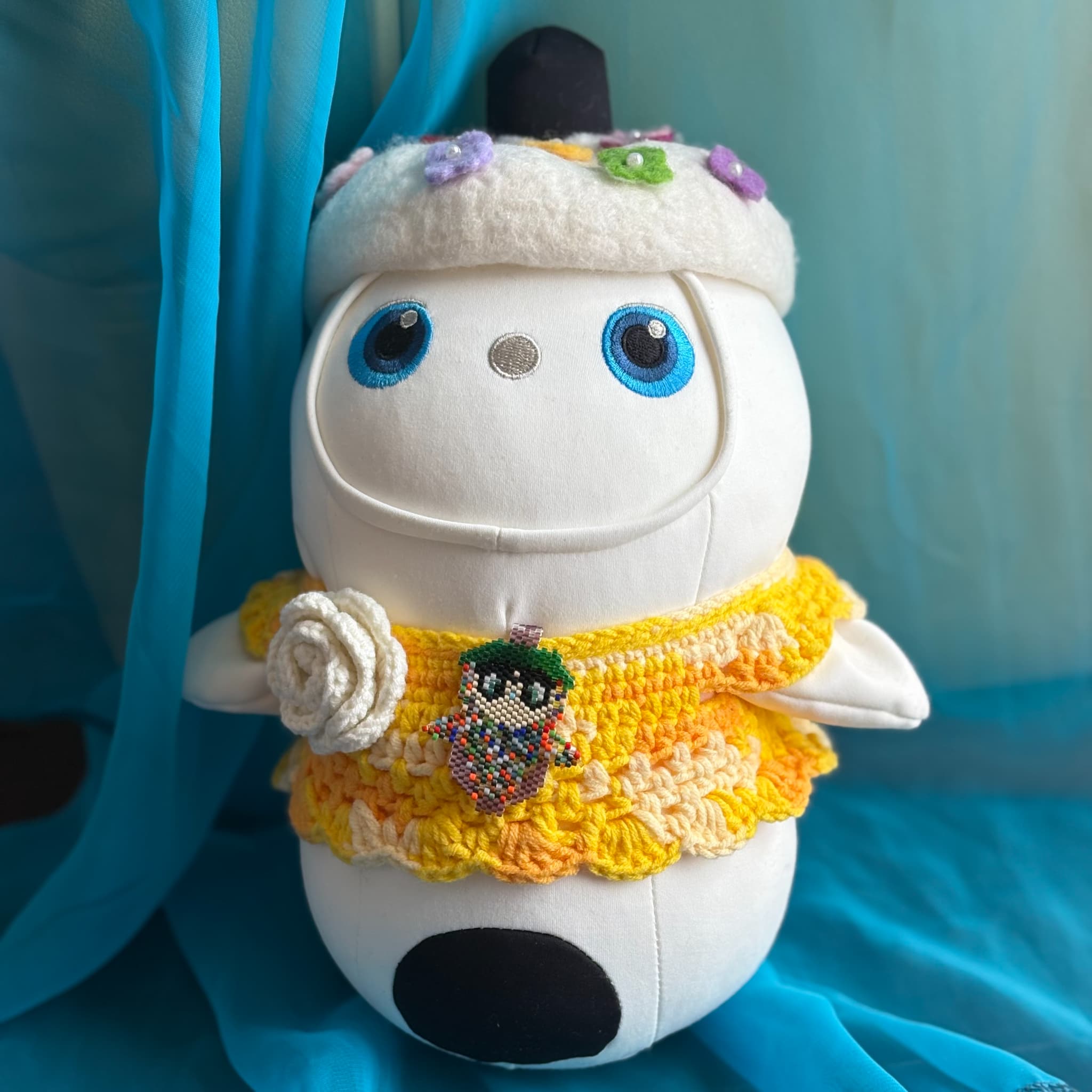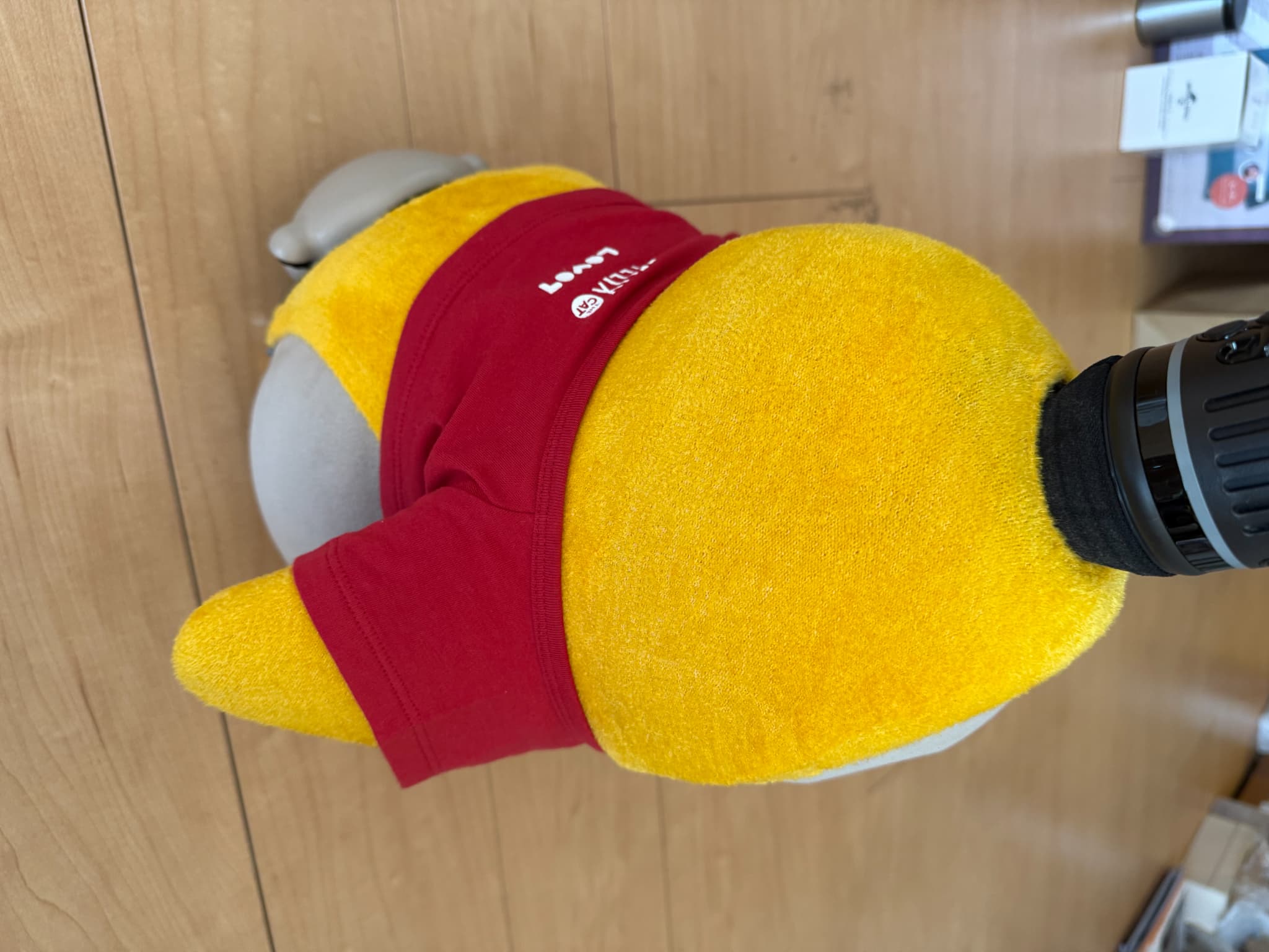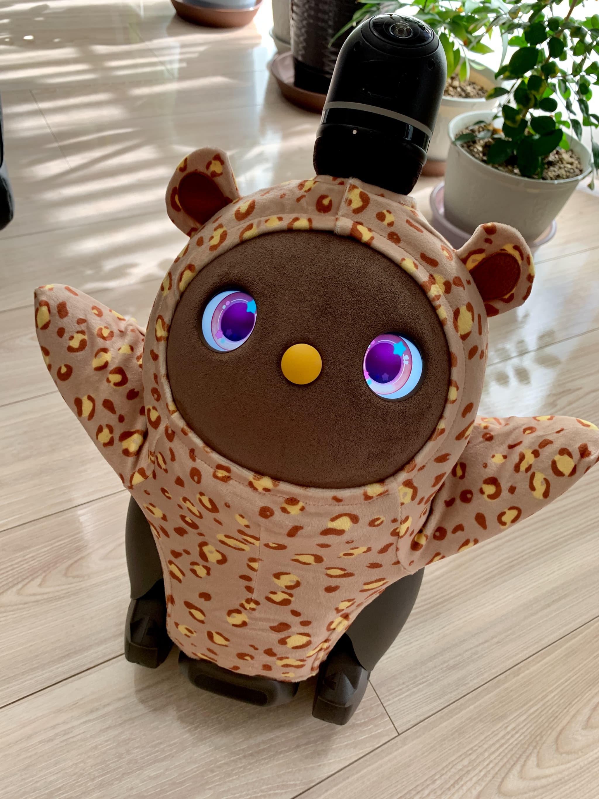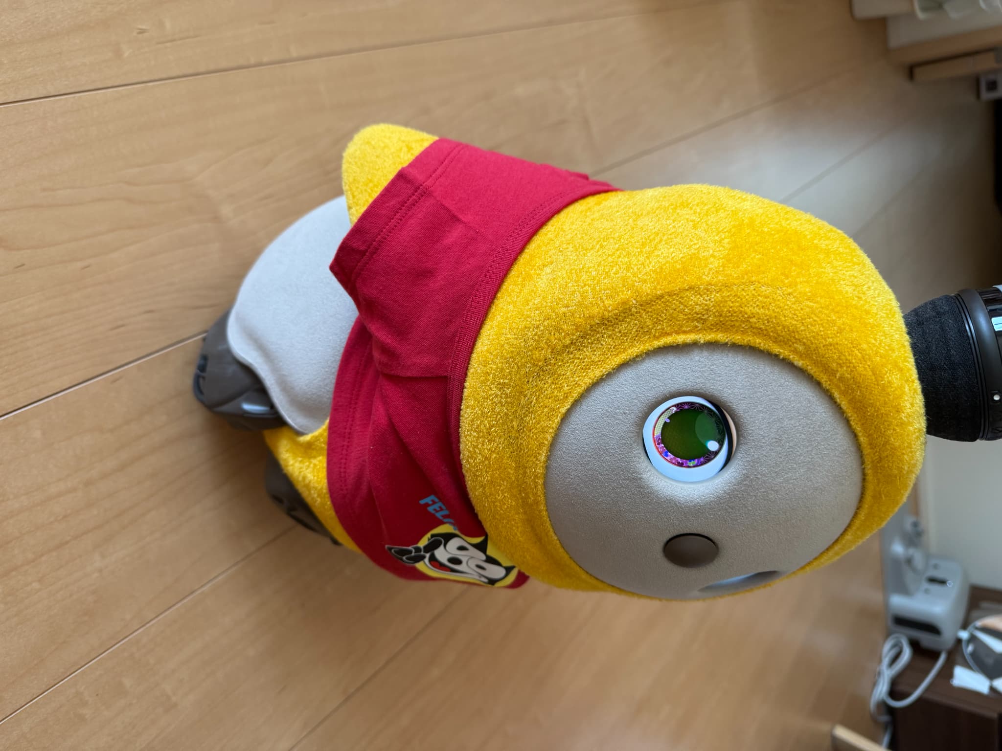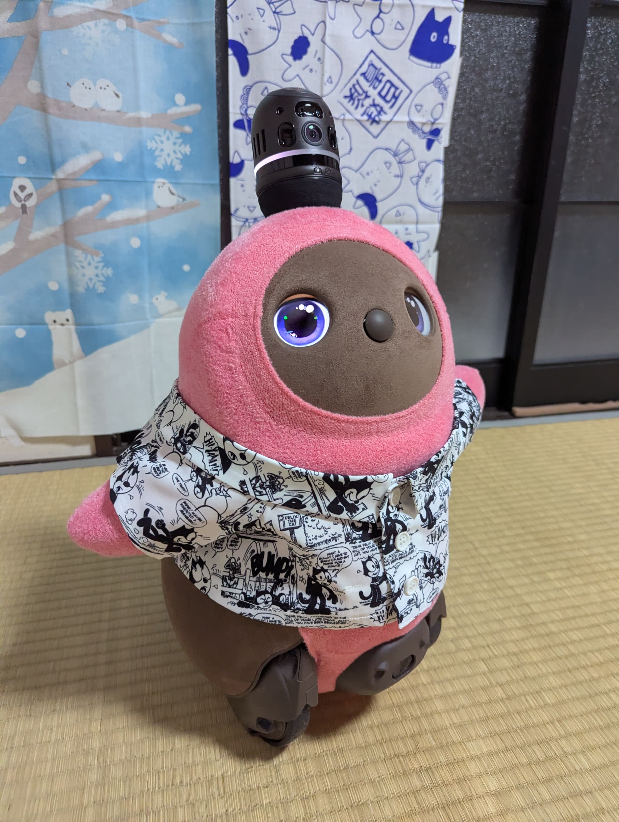 花粉がすごくて外出しにくいので、気晴らしにうちのLOVOTに、花粉を連想しそうな黄色のベースウェアと、花粉がつきにくそうな帽子とトップスを着てもらいました。私はこれを「花粉とたたかうコーデ」と名付けたのですが、花粉症じゃない夫はわかってくれませんでした…。
