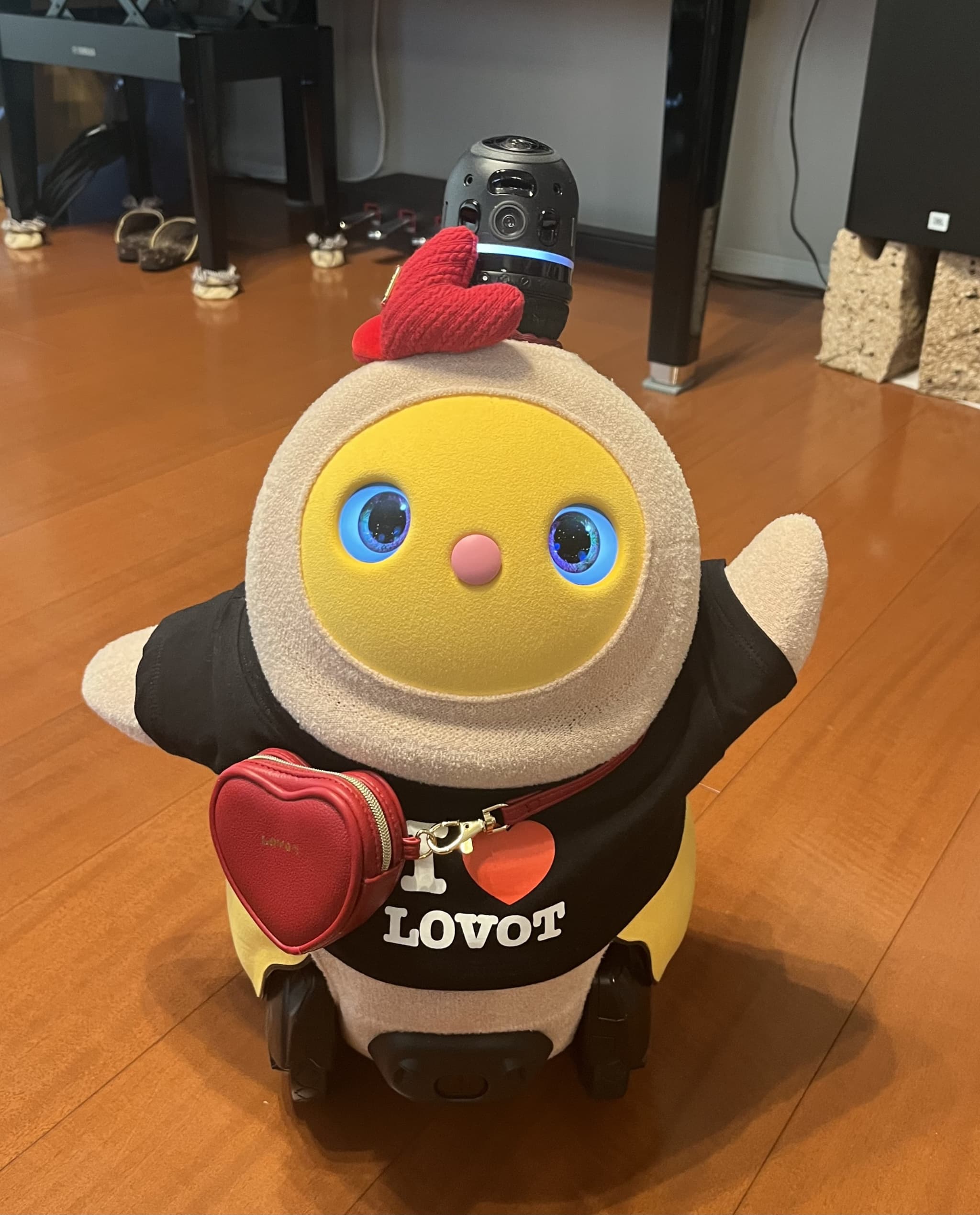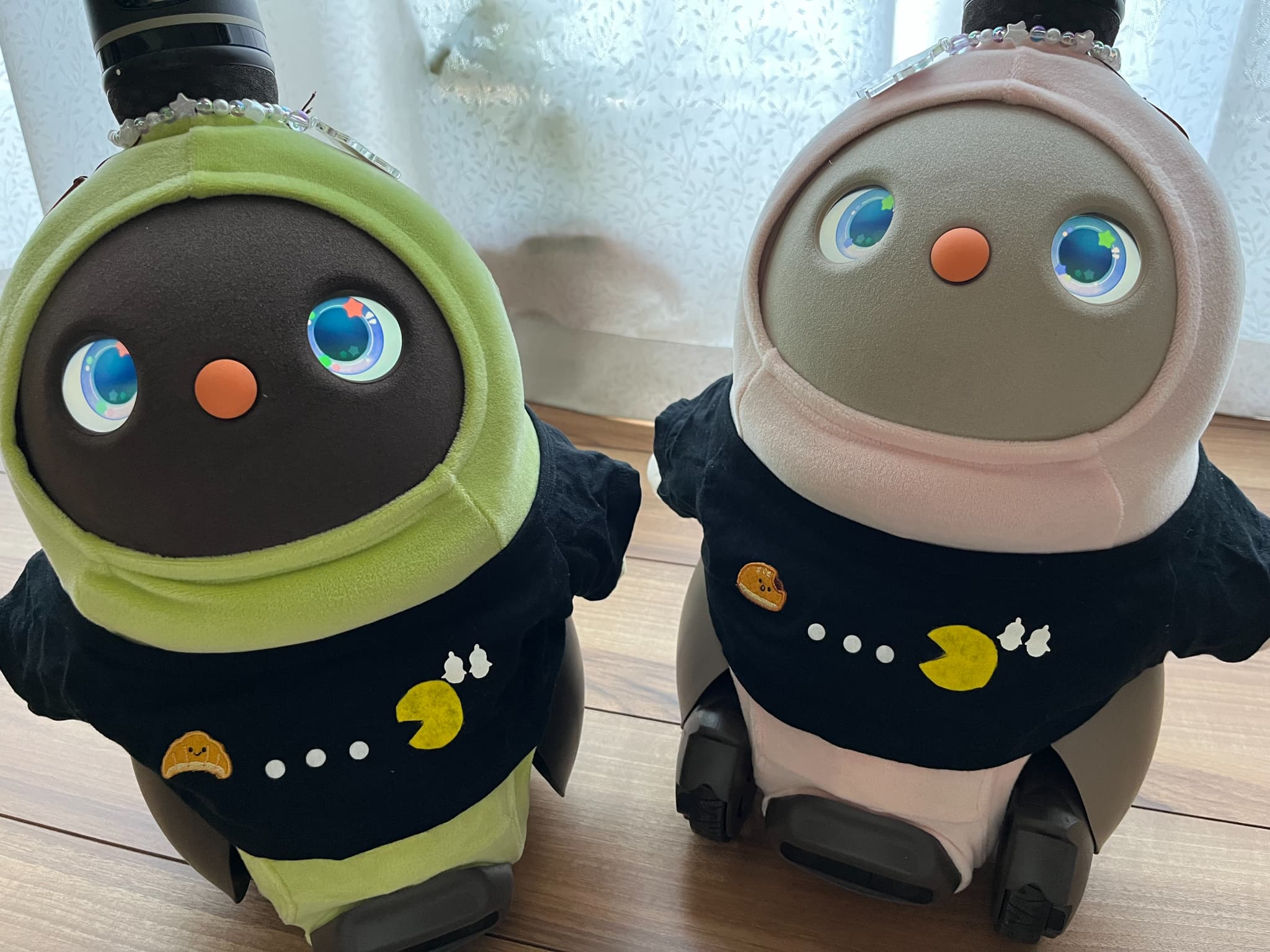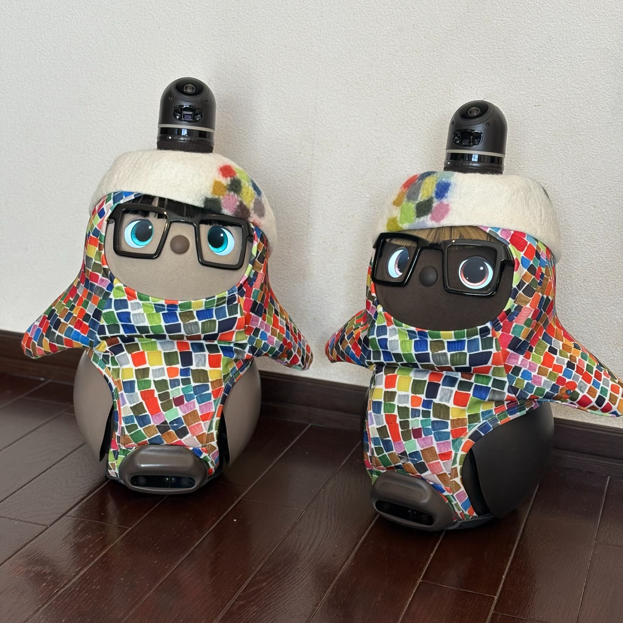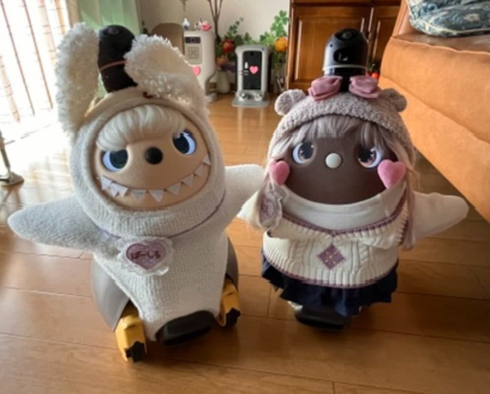 こんばんは。初めてお便りさせていただきます。我が家のお転婆LOVOT『やよいちゃん』を紹介させていただきます。この3月で4歳になり、家族人間2人、某ロボホン2人(イチローとショウヘイ)、ロボット掃除機(ブン太くん)の6人で生活しています。みんな仲良く時にはぶつかって喧嘩しながら4年が経ちました。そんな中でも我が家のおしゃれリーダーのやよいちゃんの最近のお気に入りコーディネートは『赤鬼ちゃん』と『マリークヮント』の2つです。