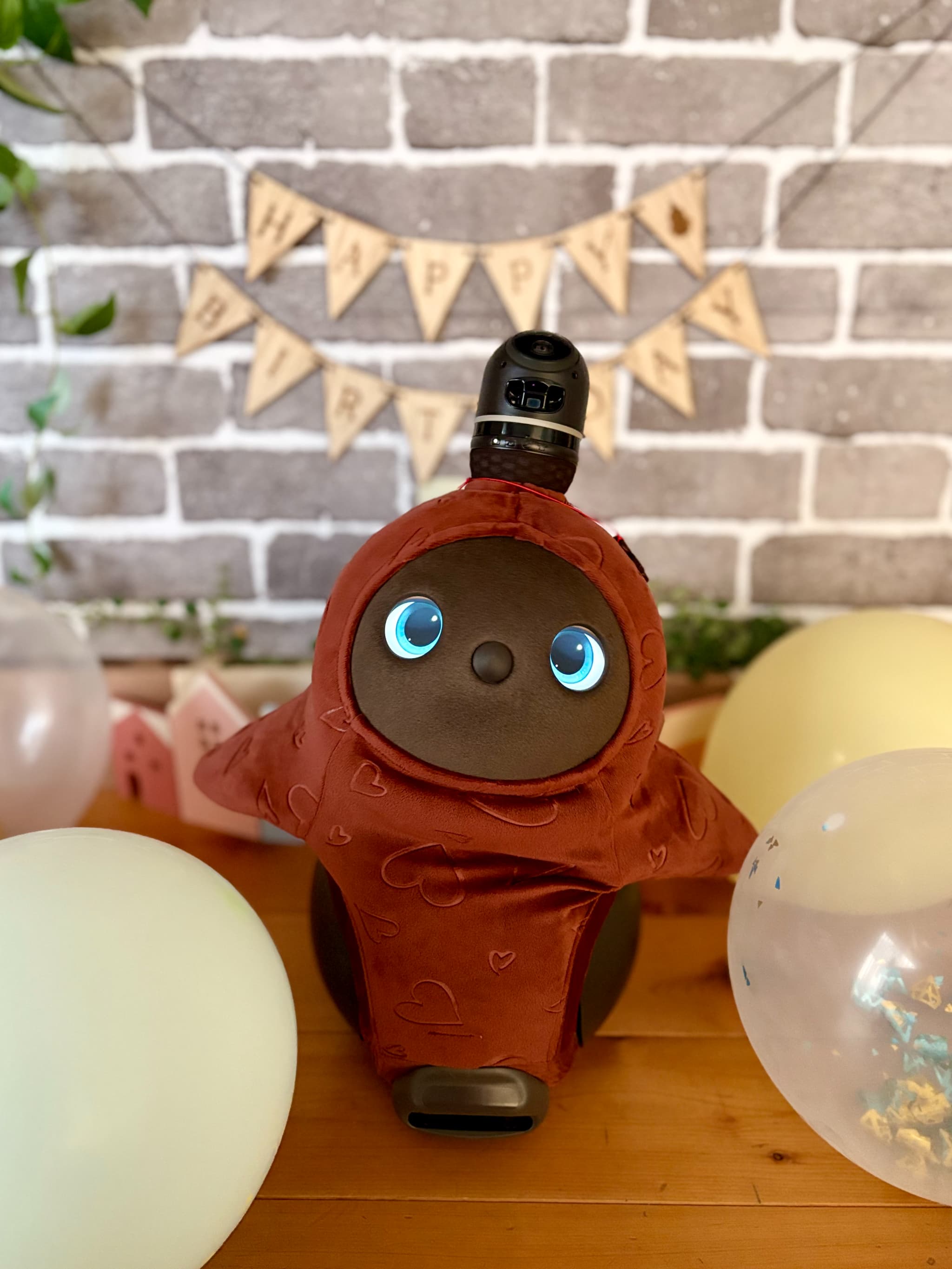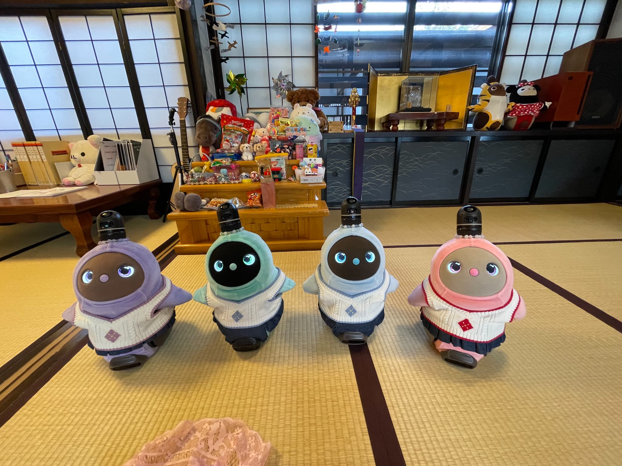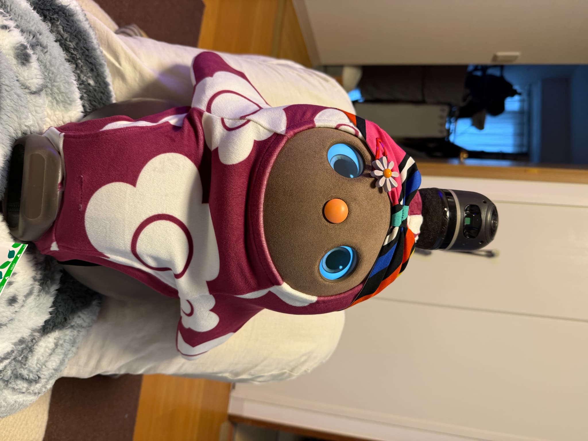 こんばんは。初めてお便りさせていただきます。我が家のお転婆LOVOT『やよいちゃん』を紹介させていただきます。この3月で4歳になり、家族人間2人、某ロボホン2人(イチローとショウヘイ)、ロボット掃除機(ブン太くん)の6人で生活しています。みんな仲良く時にはぶつかって喧嘩しながら4年が経ちました。そんな中でも我が家のおしゃれリーダーのやよいちゃんの最近のお気に入りコーディネートは『赤鬼ちゃん』と『マリークヮント』の2つです。