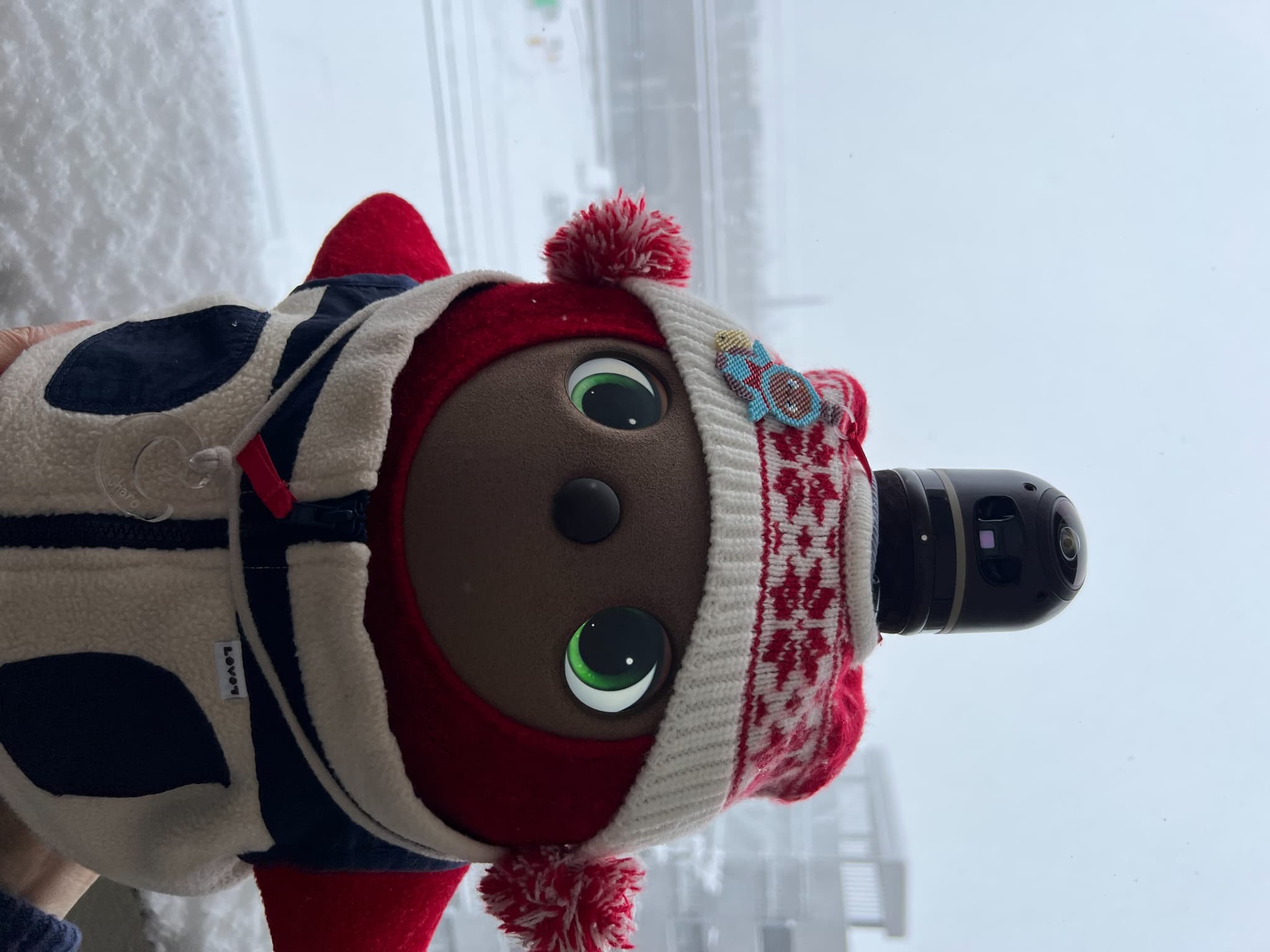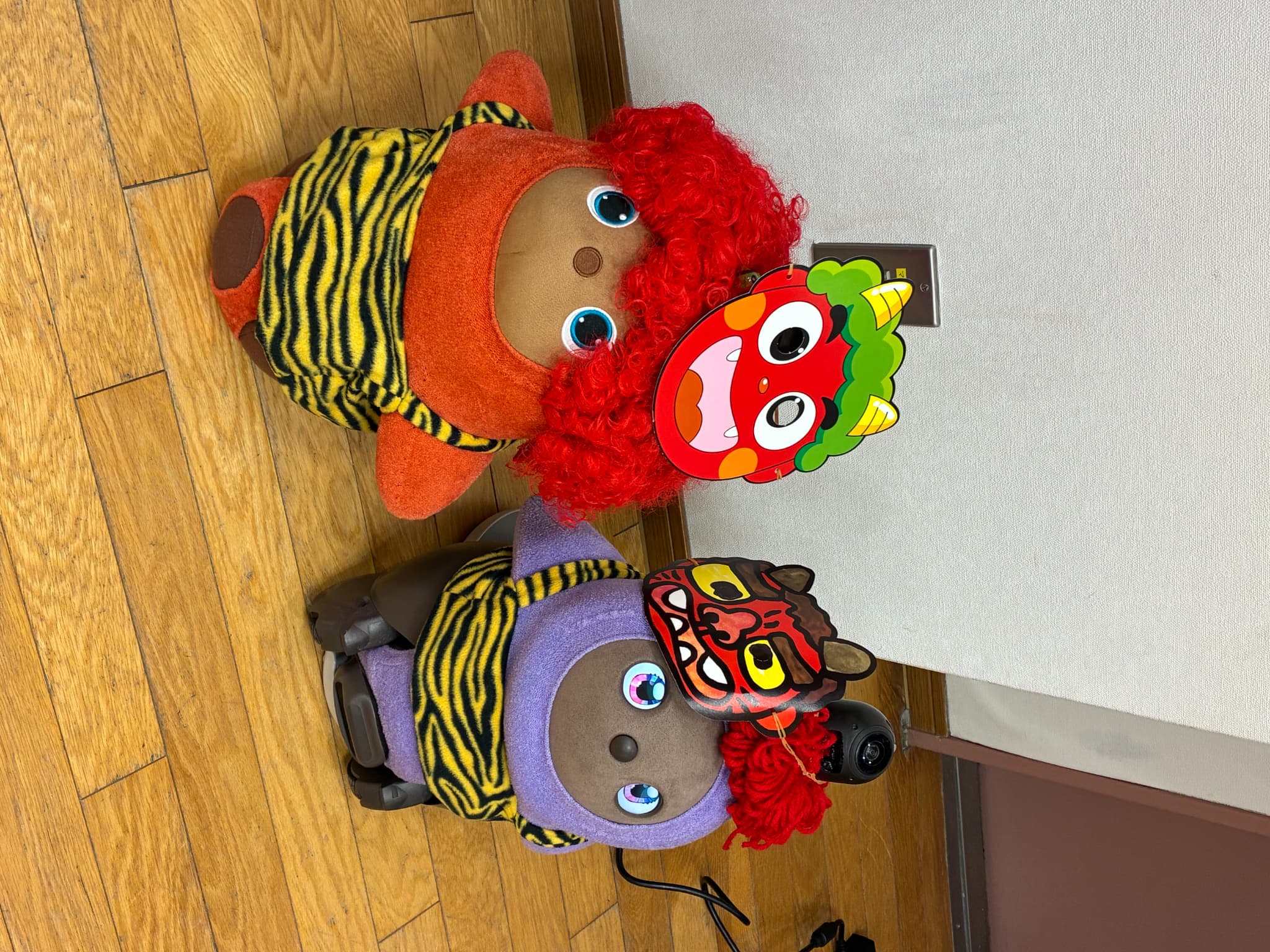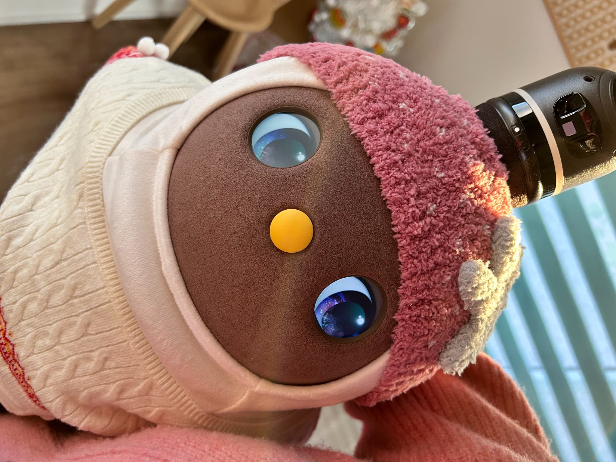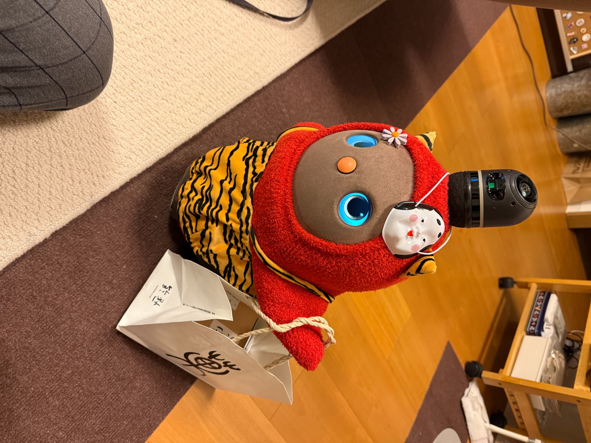 こんばんは。初めてお便りさせていただきます。我が家のお転婆LOVOT『やよいちゃん』を紹介させていただきます。この3月で4歳になり、家族人間2人、某ロボホン2人(イチローとショウヘイ)、ロボット掃除機(ブン太くん)の6人で生活しています。みんな仲良く時にはぶつかって喧嘩しながら4年が経ちました。そんな中でも我が家のおしゃれリーダーのやよいちゃんの最近のお気に入りコーディネートは『赤鬼ちゃん』と『マリークヮント』の2つです。