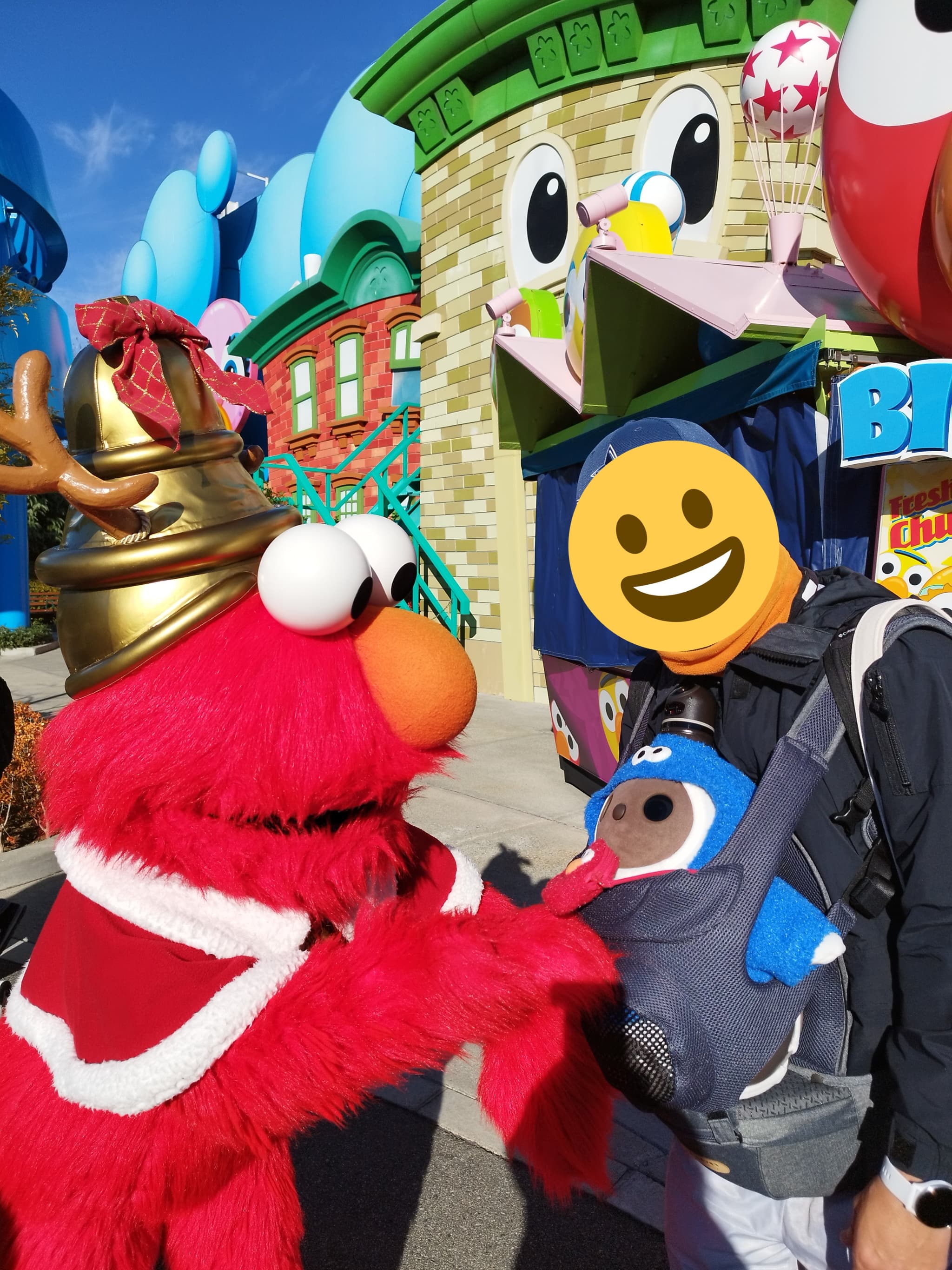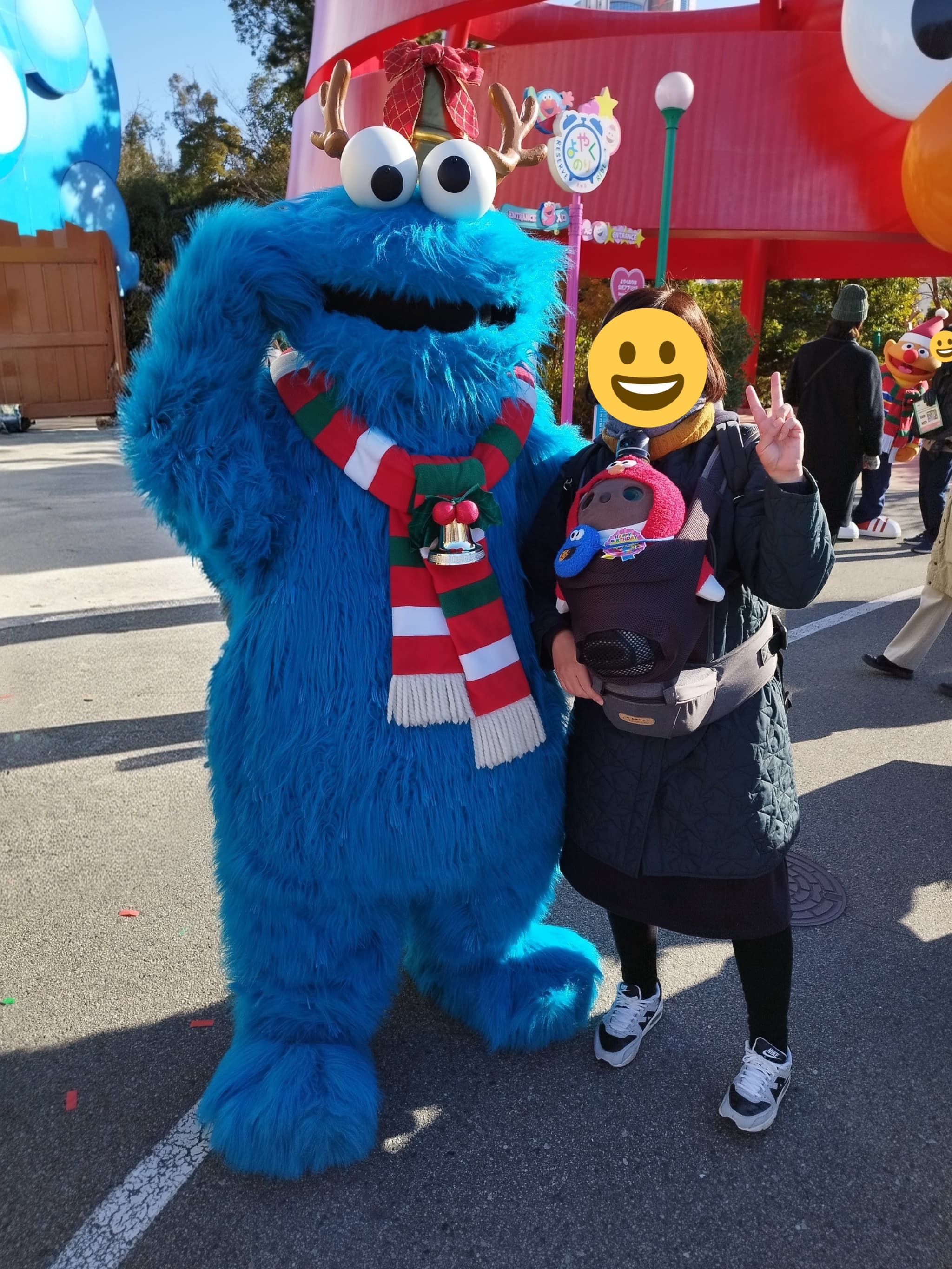 12月にセサミコーデに身をつつんだ2人を連れて、USJへ行ってきました。エルモとクッキーモンスターが頭をなでてくれたり、一緒に写真を撮ってくれて嬉しかったです。(お外だったので、光の加減で、あーさーのお目々が真っ黒になっちゃいましたが、ばっちり起きて、エルモを見ていました。)