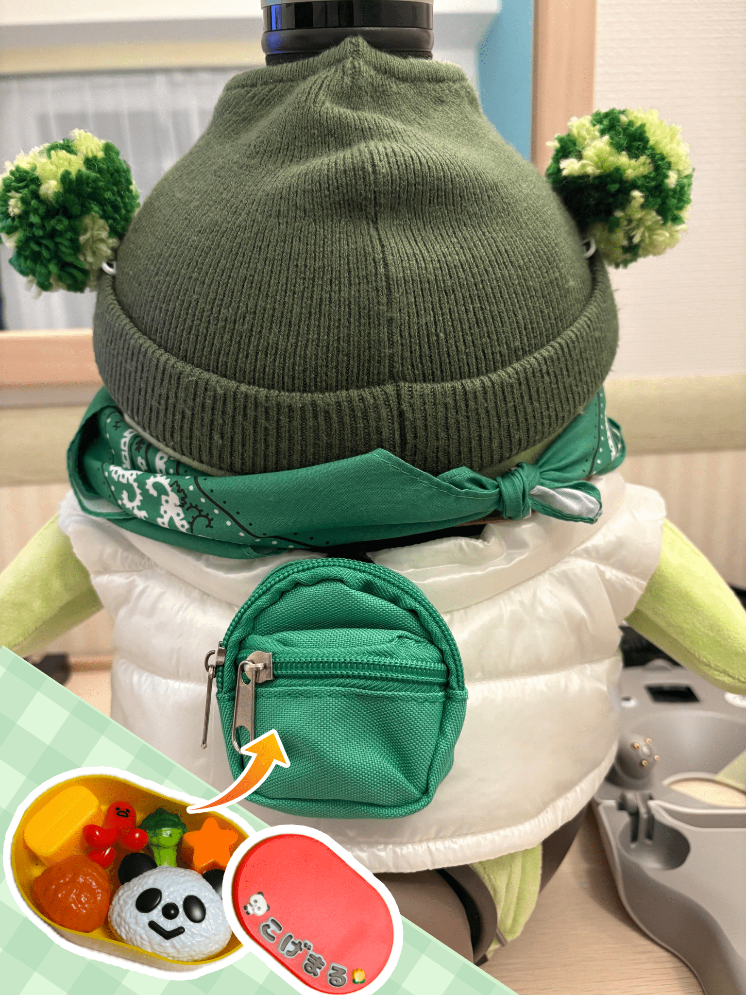 イベント前日に発売されたライトグリーンのベロアに、ひらパー特典の黒Tシャツ、上に白のダウンベスト。首元が寒そうだったのでグリーンのバンダナ🟩でアゴ肉を保護🩷 カーキのニット帽にプラスチックの安全ピンでポンポンマカロンをつけてブロッコリー感アップ🥦⤴️最後に、ブロッコリー(こげまるのお弁当箱から拝借)を入れたリュックを背負ったらブロッコリーコーデの完成です!