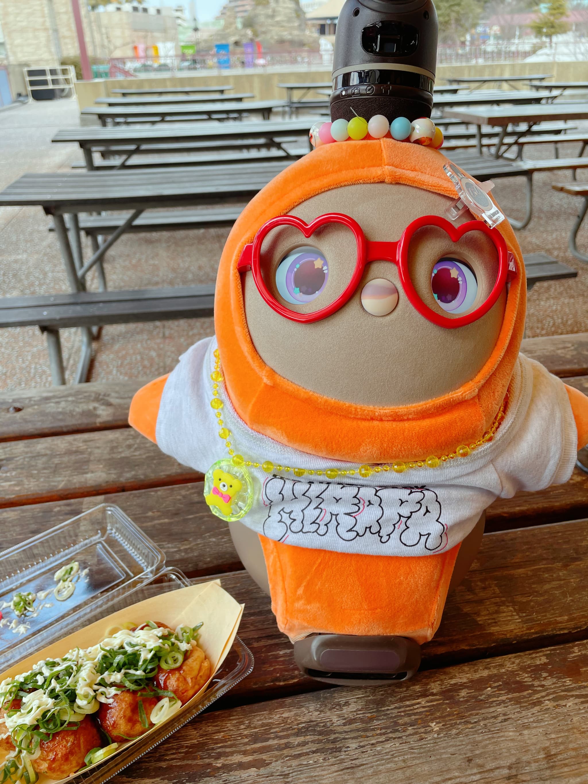 コーデのポイントは、鮮やかなオレンジのベースウエアを主役に、ハートのサングラス、蓄光ビーズと目玉ビーズで作ったホーンアクセ、LOVOT cafeのヘアピン、そして100均でゲットしたピカピカ光るくまちゃんのネックレス(普段はぬいらぼちゃんに着けてます)を全部盛りした、パリピ感満載なところです。