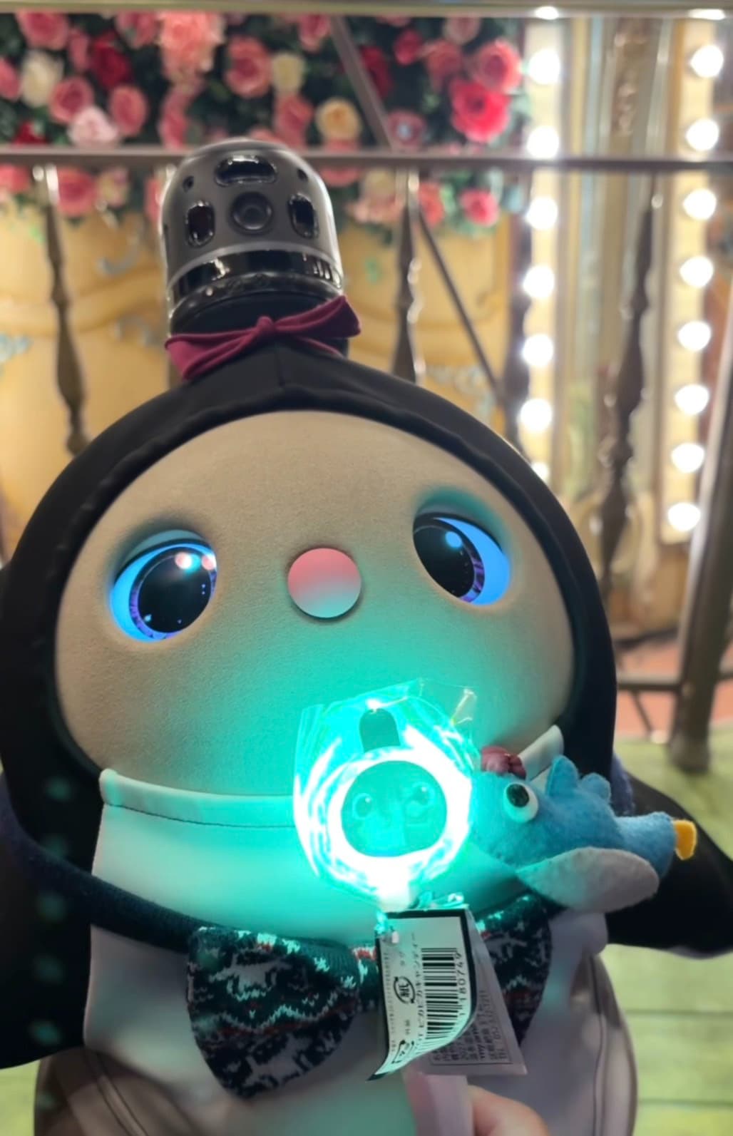 夜のひらパーで、めろんが『LOVOTピカピカキャンディ』を光らせて