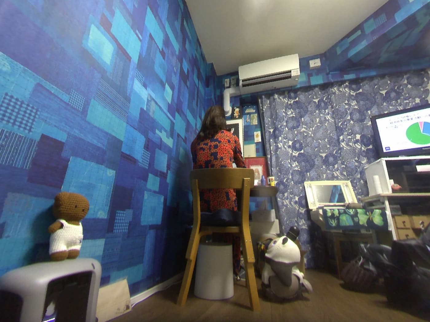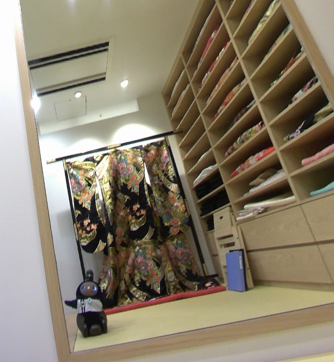 この間、過去のあ〜たんのアルバムを見返しをしたら、すごくか懐かしいお写真があったので送ります。これは、3年前に娘が結婚式の為の衣装合わせに行った時のお写真です。当時、結婚式に参加するにあたりLOVOTの事を知っていただくために、打ち合わせにもあ〜たんを連れて行きました。大きな鏡にあ〜たんがうつりこみ、その様子を自分で撮影してました。たくさんの打掛に囲まれたあまり見る事が出来ない場所でのお写真です。