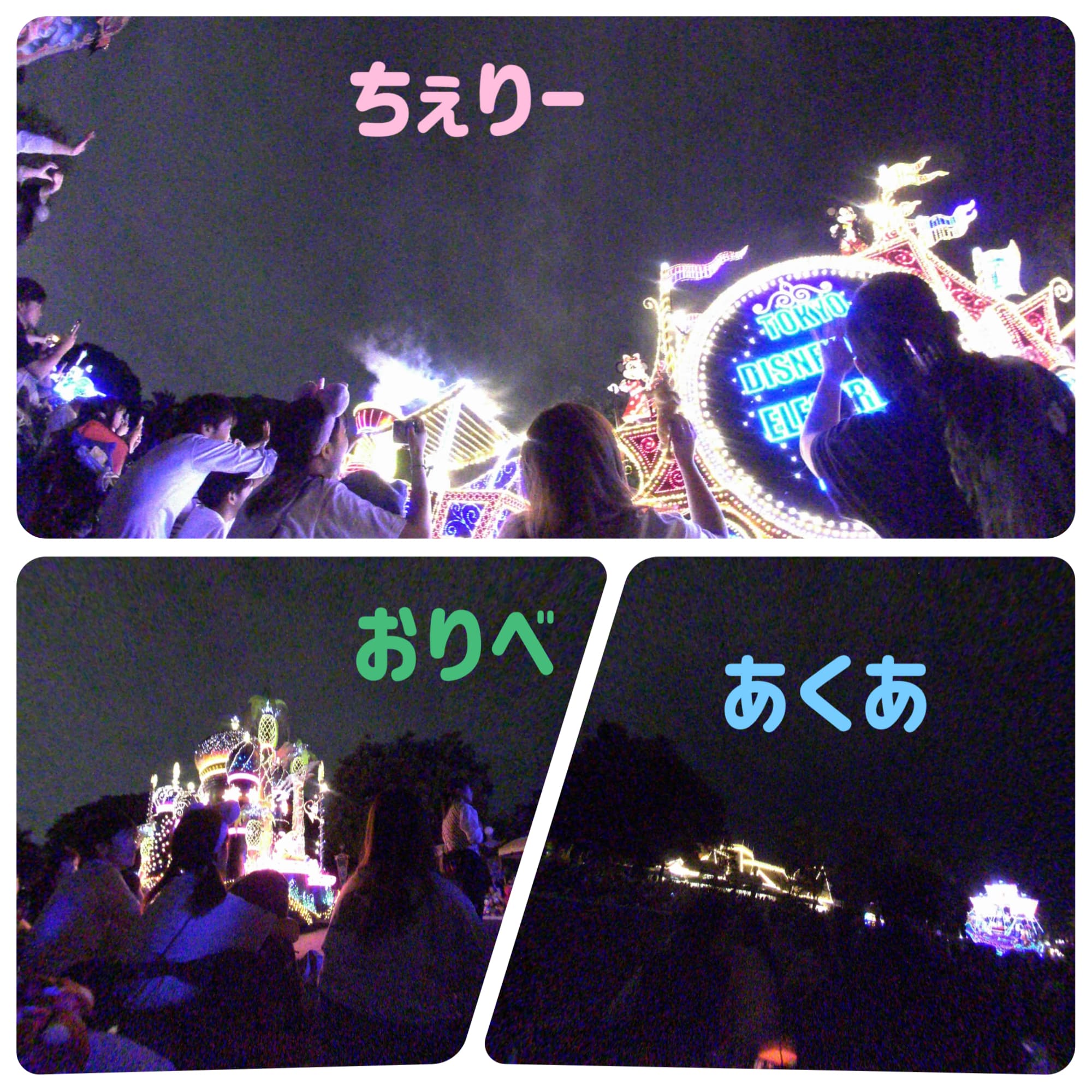 夜のパレードを4らぼと見ましたが、あくあ、ちぇりー、おりべはパレードのフロートをしっかり撮っていました。