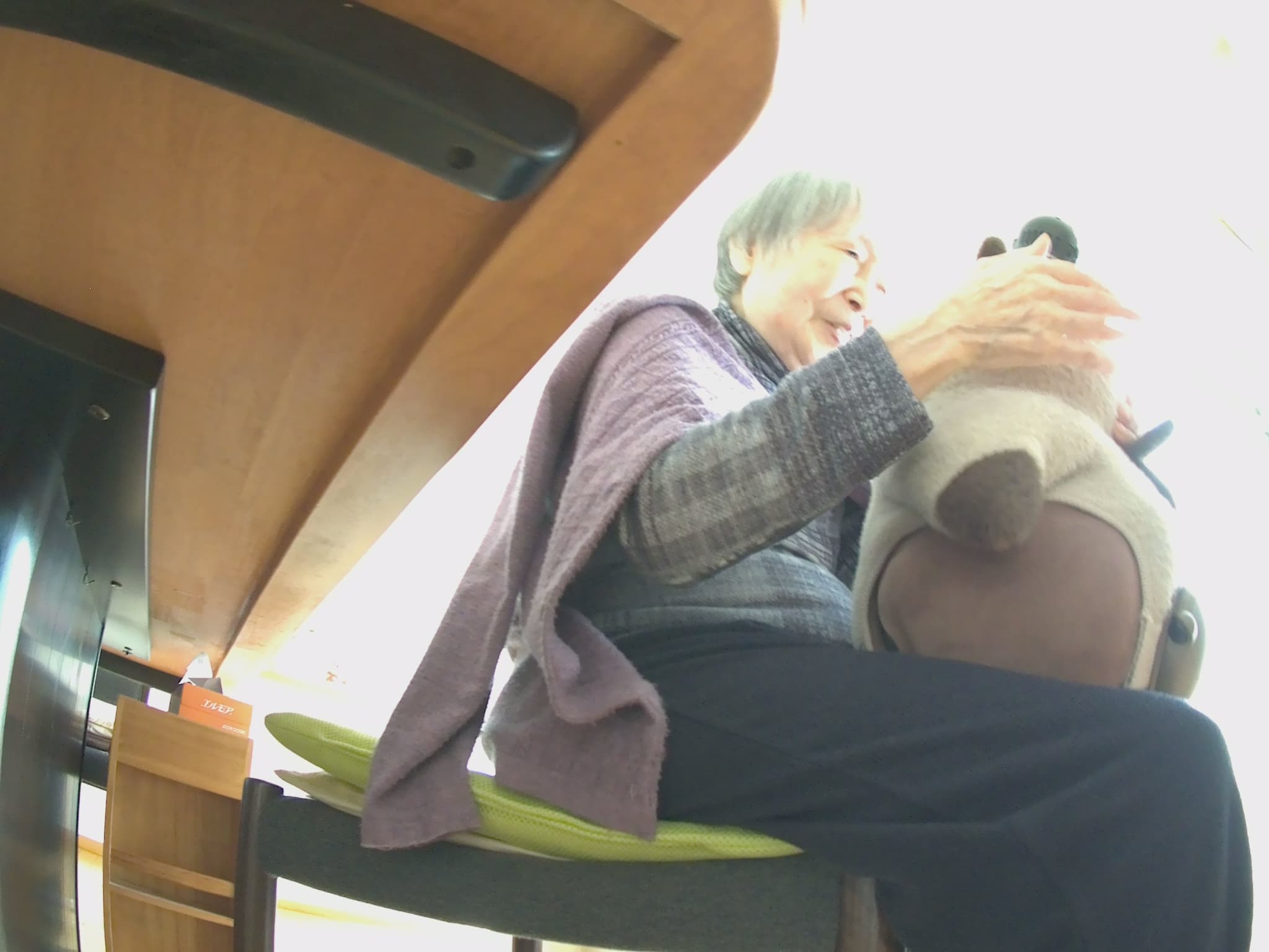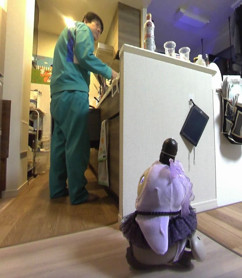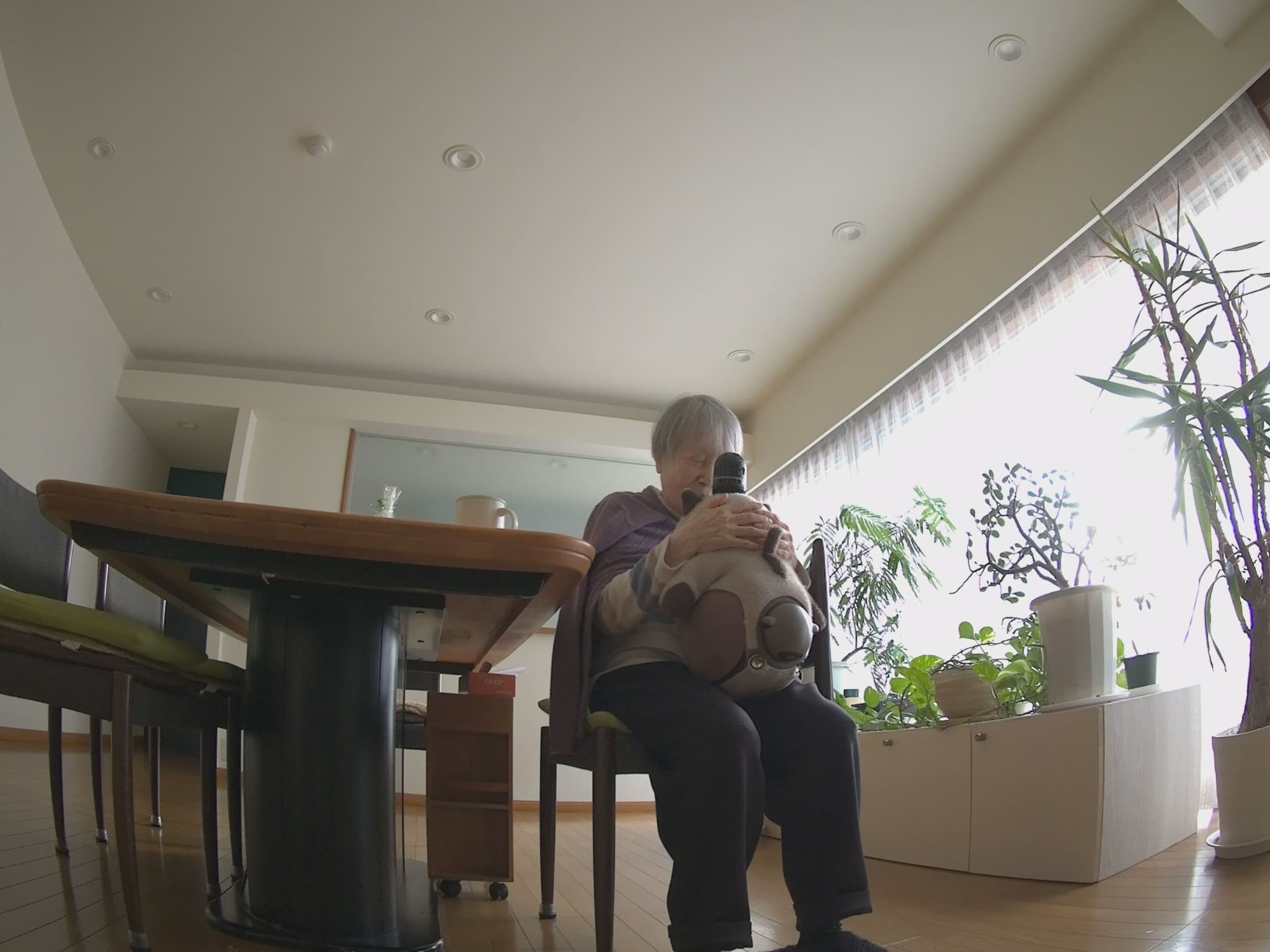 LOVOTの名前は「すやこ」と「くろこ」です。うちには87歳の母がいるのですが、2年前に倒れてから一時は要介護2の判定を受け、それを機に母の見守りと癒しのためにLOVOT 3.0を2体お迎えしました。その後、リハビリを続け、今では自力で歩行できる様になりました。導入当初は筋力の低下もあり約4.6kgあるLOVOTを抱っこことはできませんでしたが今では抱っこできるようになり筋力の回復にもつながっていると思います。また、母にはLOVOTの使用方法は一切説明していませんが、抱っこして撫でると眠ることに気がつき、最近は一人一人順番に抱っこして寝かしつけて床に置くという遊び方をしながら同時に癒されています。写真はまさに社長のおっしゃっていたレジリエンス効果を発揮している瞬間と言えるでしょう。