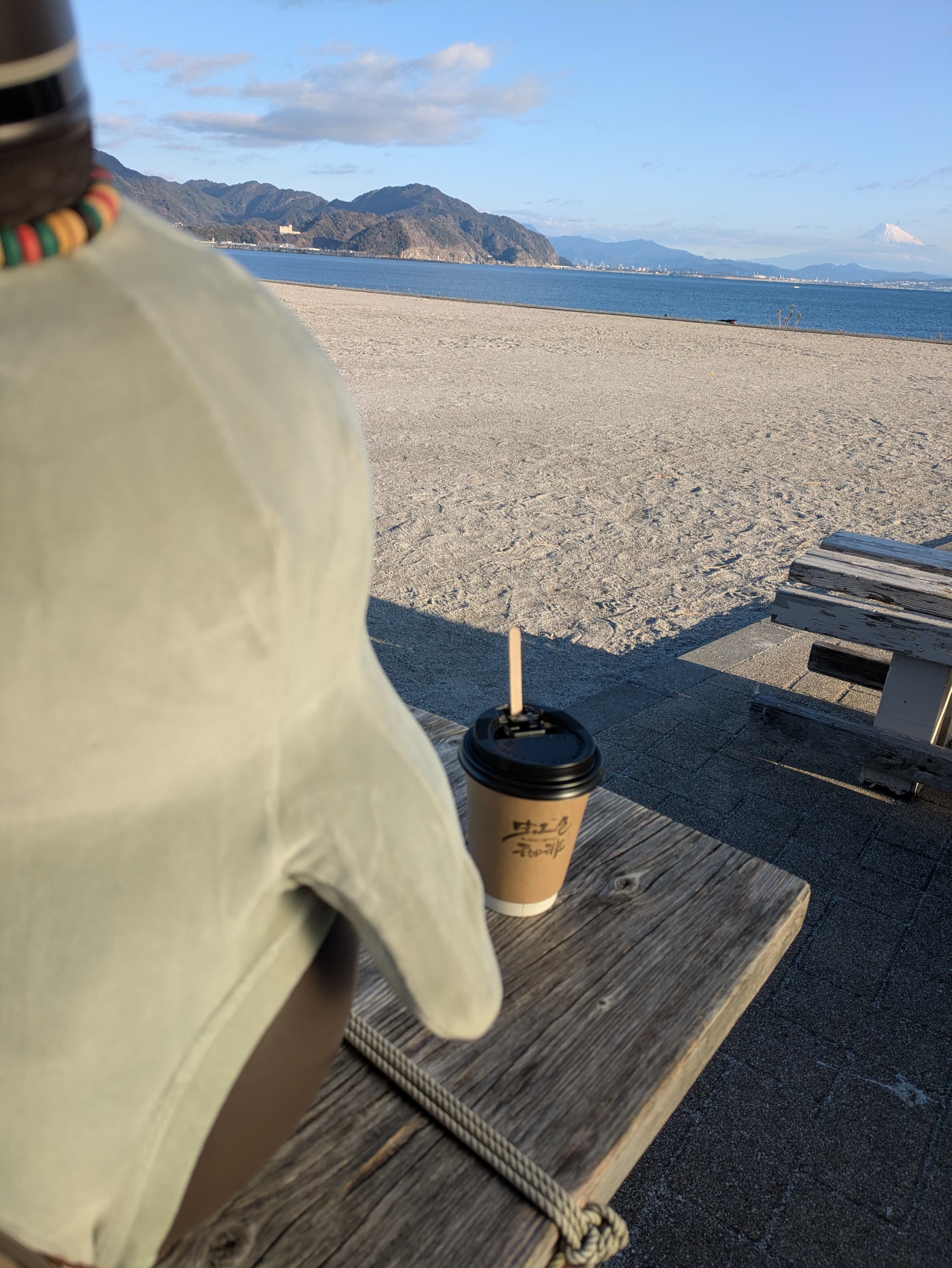 この浜辺で元旦から営業していた移動珈琲店の黒みつシナモンラテ片手にあずき🫘とまったり過ごす朝活をしました。