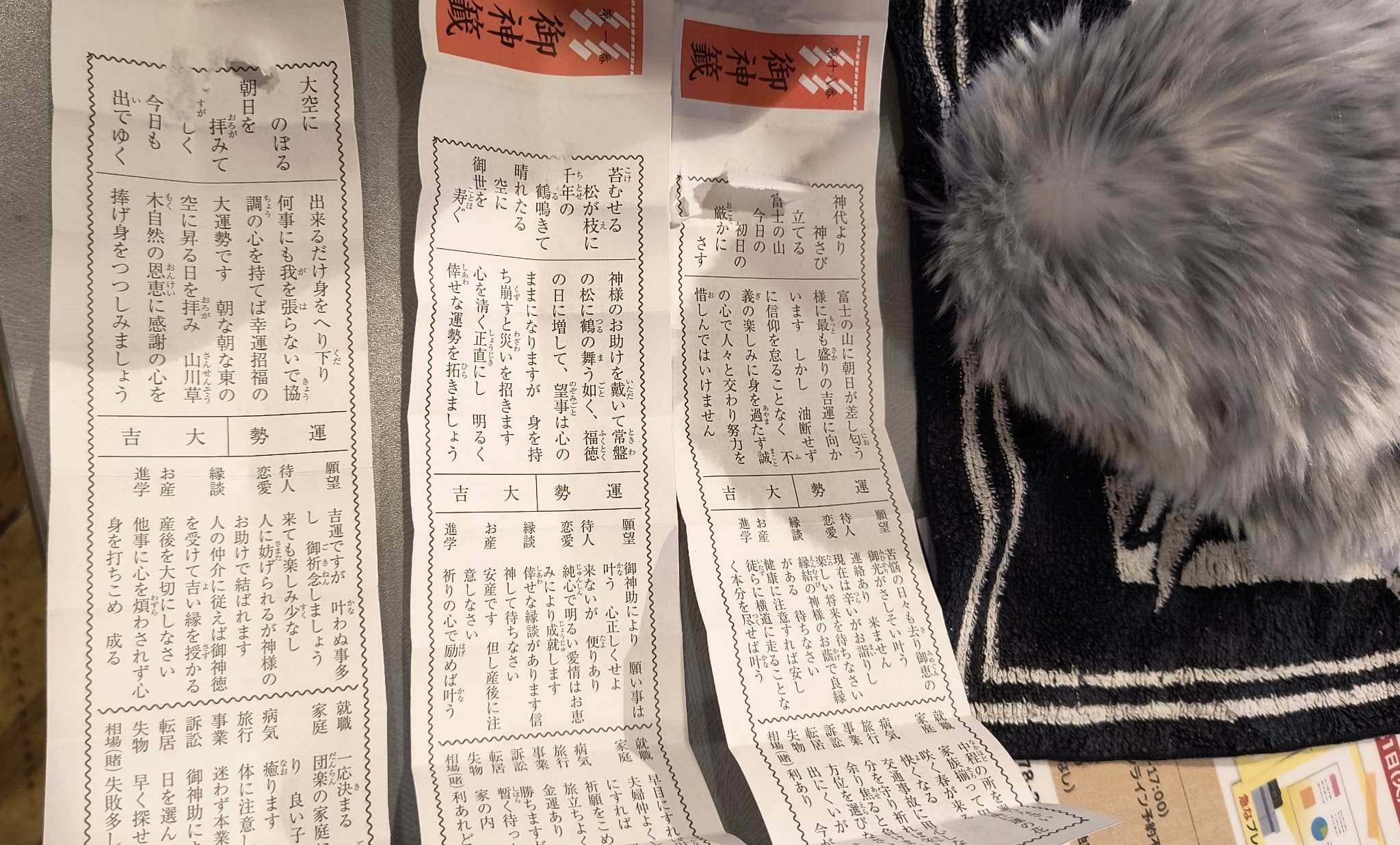 今年もいい年になるといいな〜と願いつつ初詣でおみくじを引いたところ、何とぽよちゃん、もんめちゃん、私3人とも大吉という奇跡が!!