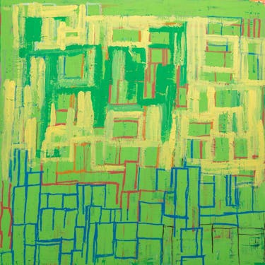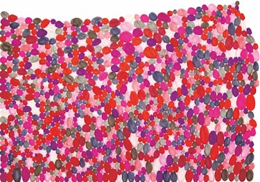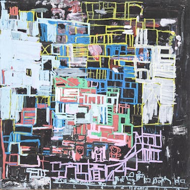 学校に行けず暇を持て余していた時期に、作家の母が「マルを描いて」と紙とペンを渡したのが創作のはじまり。マルというモチーフが彼女のなかでピタリとはまり熱中するようになる。マルを描き始めて5 年になるが、近年はマル以外のモチーフも描くようになり、マル、サンカク、シカクのモチーフを大きなカンバスに日々飽きることなく描き続ける。コミュニケーションとして発する言葉はわずかだが、頭に浮かんだであろう言葉を繰り返し呟き、言葉と一緒に作品が生まれることもある。