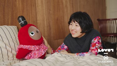 互いを見つめ合い、ゆっくりと近づくと、アートは言葉を超えて、作家とLOVOTを結び、いつしかその存在は“もうひとりの家族”へと変わっていきます。